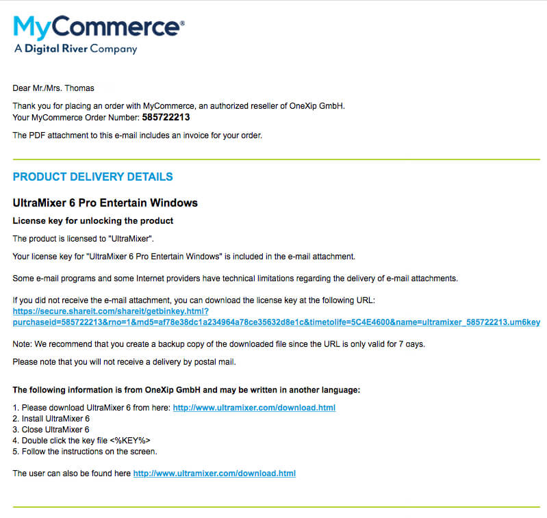 After purchasing an UltraMixer license, you will automatically receive an email from our license reseller MyCommerce with your Order Number and the activation key file.