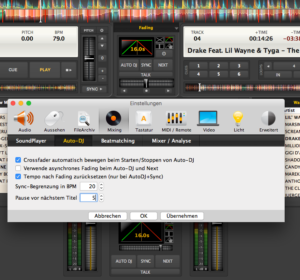 Here you can adjust further settings such as a BPM sync limit, asynchronous fading, the “Pause” Feature, or getting the crossfader moved automatically when Auto DJ starts and stops.