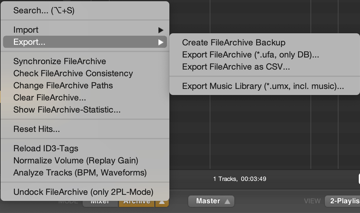 You can easily export your FileArchive within UltraMixer. Open the Menu by clicking the arrow button next to “Archive” in the bottom bar of your UltraMixer. Select “Export” and choose between the different methods.