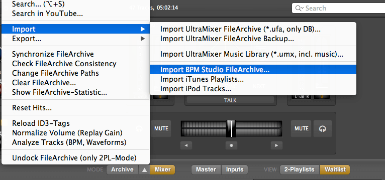 Start UltraMixer and click on the arrow between “Archive” and “Mixer” in the menu bar at the bottom and select “Import” > “Import BPM Studio FileArchive”.