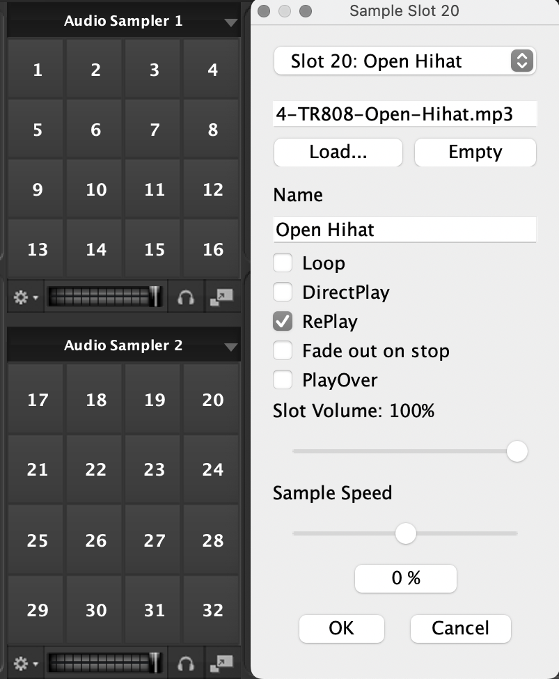 Every sample button comes with a number of playback options such as “Direct Play” or “Loop”. You can configure the button by right-clicking on a slot. We will explain all the available options below.