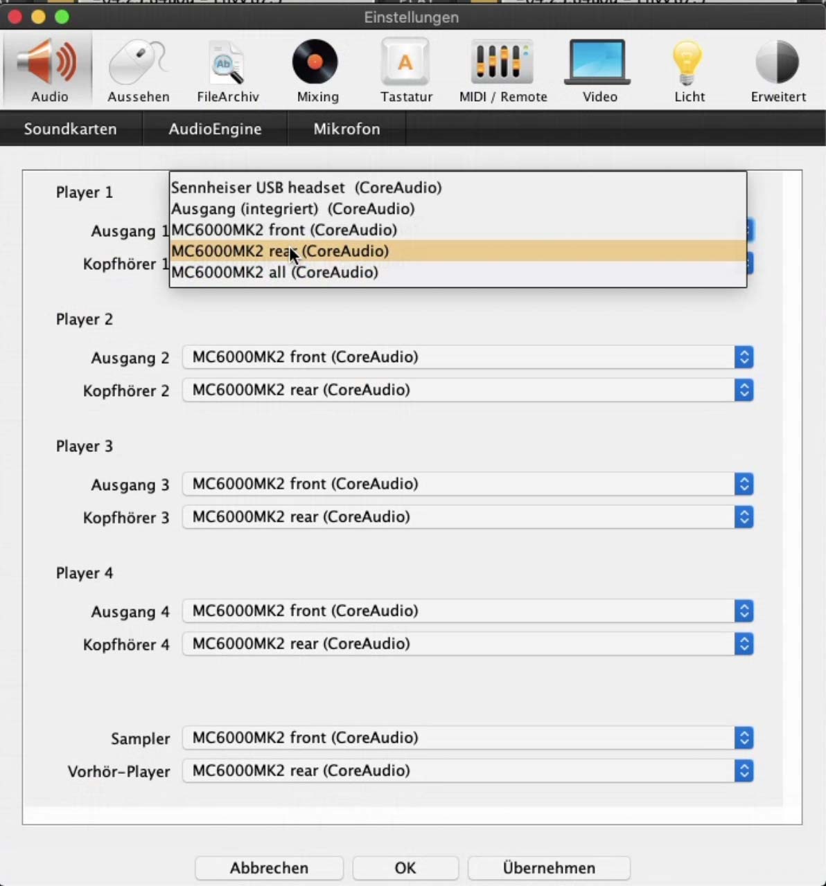For example, if you want to use headphones on the Denon DJ MC 6000 MKII for the prelistening player, you may have to select “MC6000MK2 rear” in the “Prelistening player” field, depending on your settings.