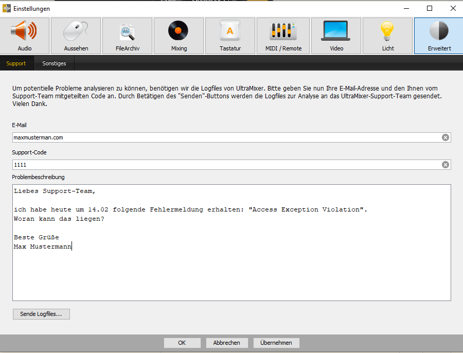 Whenever you are able to start UltraMixer successfully, the program will write a file with an event report. These logfiles contain information about your operating system, the graphics card used and, if applicable, reports on sources of errors within the program.