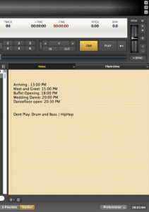 With a plan that includes important notes, like the name of bride and groom, the inauguration of the buffet and so on, you will have all the information you need at the proper time. For this case, UltraMixer supports you with a notepad widget. You can take look at your notes and moderate while operating the DJ-Software.