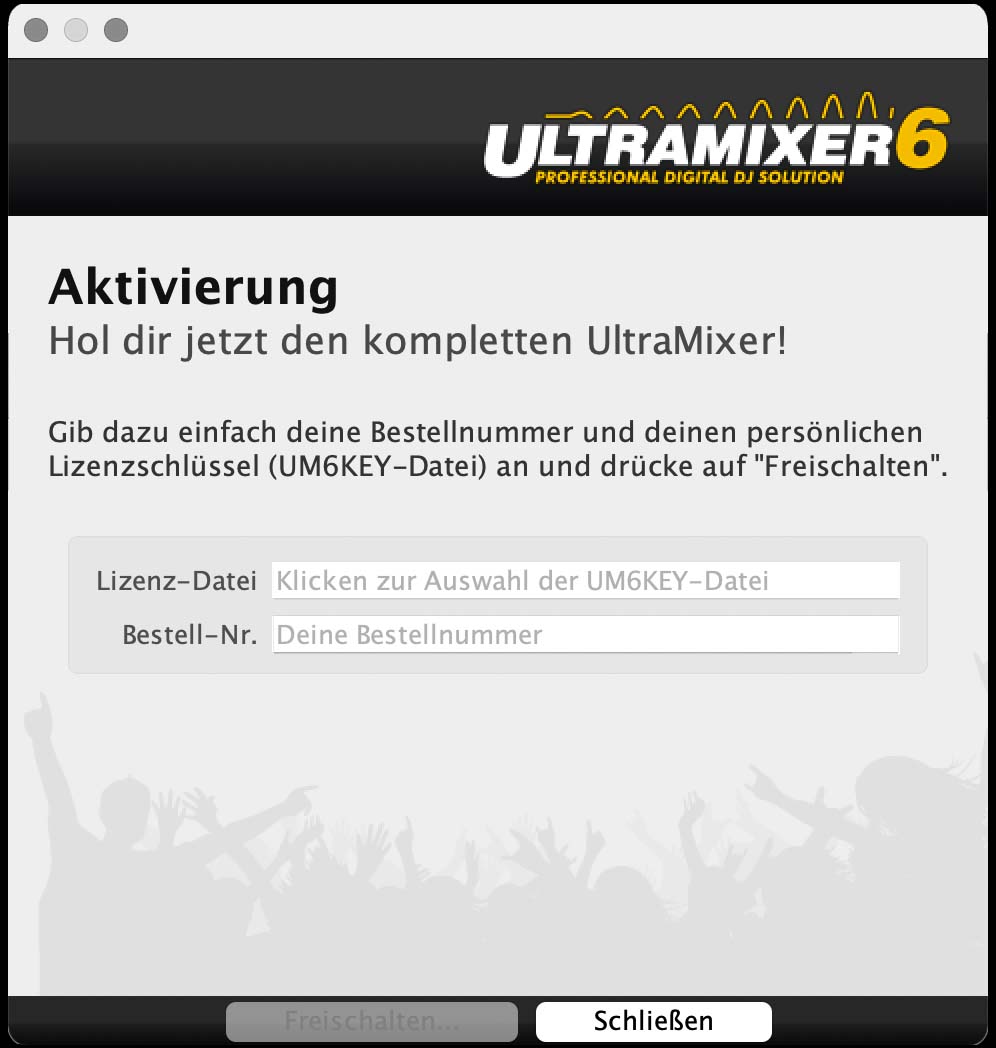 Um UltraMixer als Vollversion aktivieren zu können, musst du mithilfe dieser Seriennummer auf unserer Website eine Lizenzschlüsseldatei beantragen. Klicke dazu auf den folgenden Button um die Aktivierung durchzuführen.