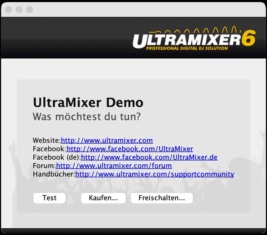 Lade dir dann die aktuelle UltraMixer-Version von unserer Homepage herunter und installiere sie. UltraMixer startet nach Öffnung des Programms als Demo. Es erscheint der folgende Dialog: