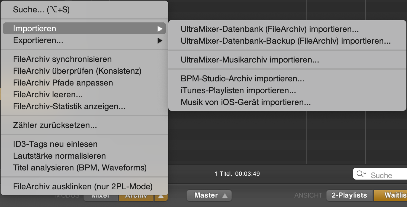 Das entsprechende Menü zum Import einer Datenbank findest du an gleicher Stelle, wie die Exportfunktion – durch Klick auf das Pfeilsymbol neben „Archive“ in der unteren Leiste von UltraMixer. Hier stehen dir wieder einige Optionen zur Auswahl. Nutze die Möglichkeit, welche zu deiner exportierten Datei passt.
