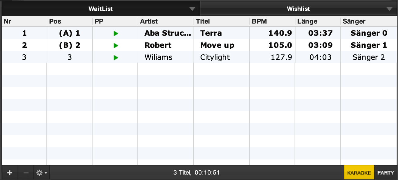 Aktiviere das Widget „Waitlist“ und klick auf den „Karaoke“ Button unten rechts. In der Waitlist wird nun eine neue Spalte „Sänger“ angezeigt, in welcher du für jeden Song den jeweiligen Namen eintragen kannst.