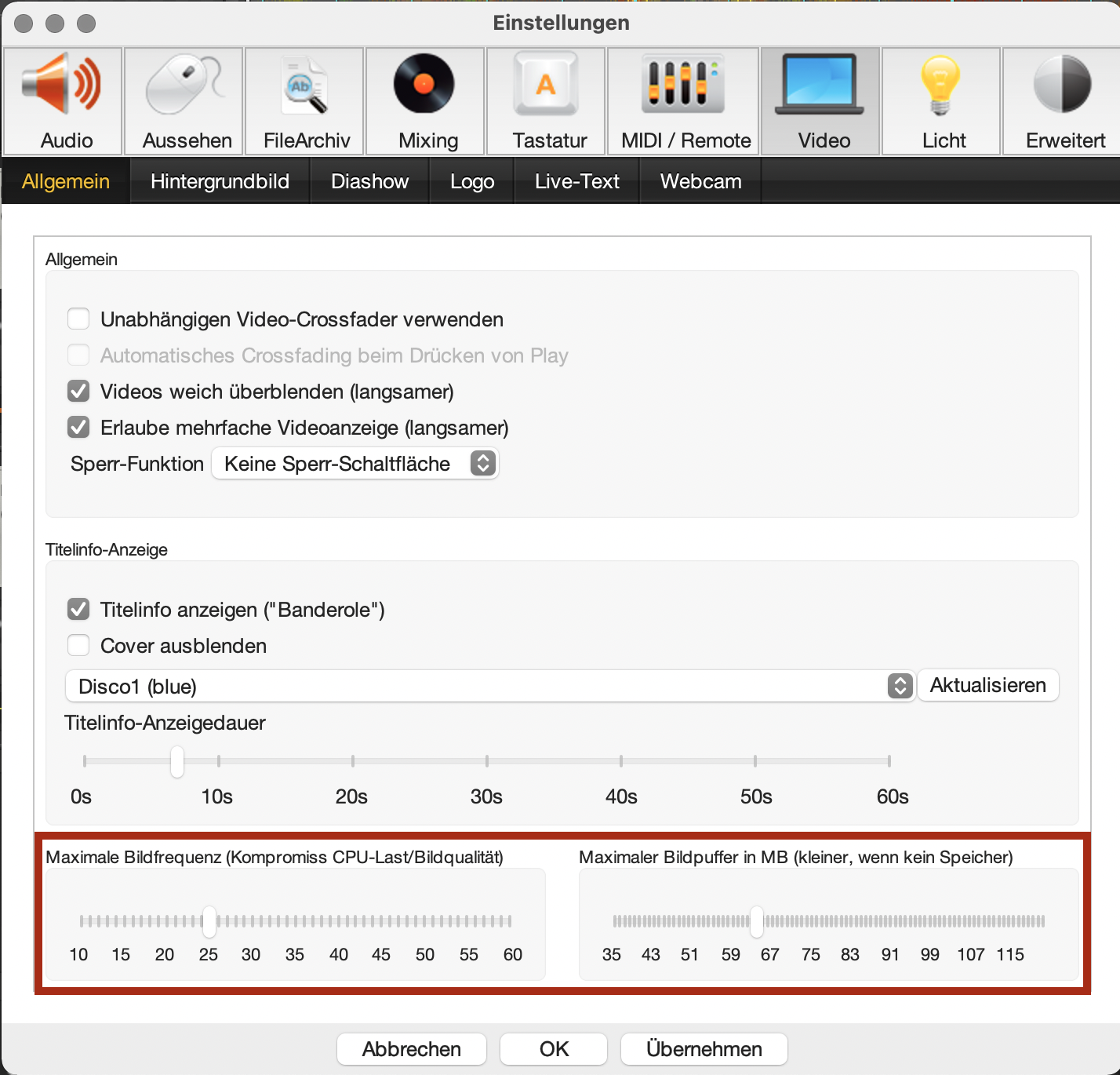 Je nach Leistung deiner Grafikkarte musst du ggf. den Videobuffer und die Framerate in den UltraMixer Einstellungen anpassen. Hier musst du testen, welche Einstellung für dein System am Besten läuft – weder zu hoch, noch zu niedrig ist optimal. Solltest du einen moderneren Rechner mit guter Grafikkarte nutzen – dann probiere einmal höhere Werte. Bei einer leistungsschwächeren Grafikkarte musst du die Werte dagegen niedriger setzen.